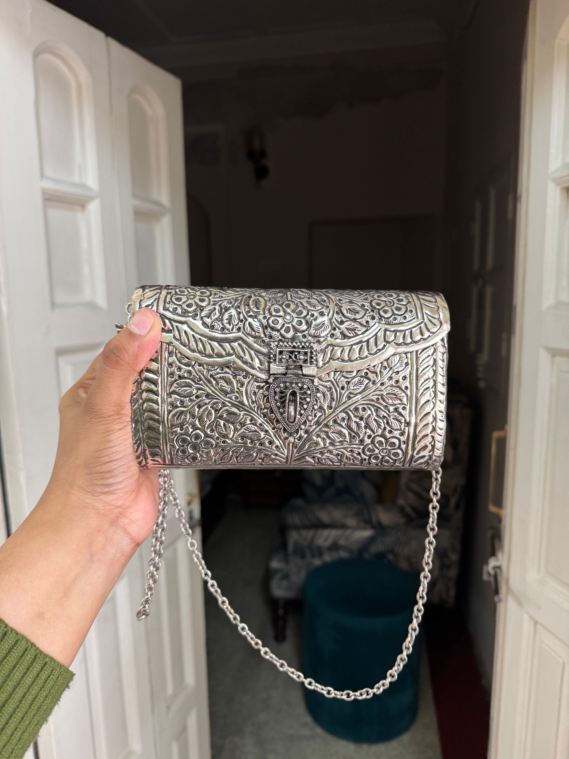 This Chandi batua features a silver finish and trendy handle, making it a stylish accessory for any outfit. With its sturdy construction and eye-catching design, this batua offers both durability and fashion. Elevate your wardrobe with this must-have piece.