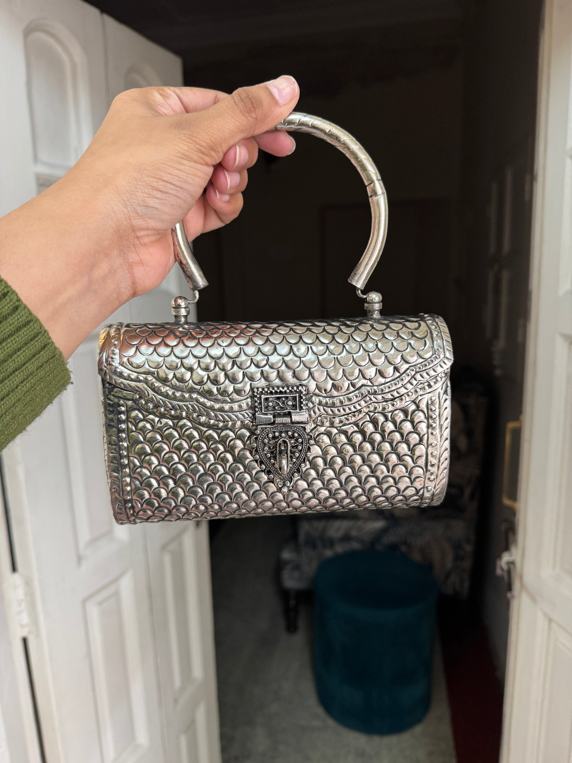 This Chandi batua features a silver finish and trendy handle, making it a stylish accessory for any outfit. With its sturdy construction and eye-catching design, this batua offers both durability and fashion. Elevate your wardrobe with this must-have piece.