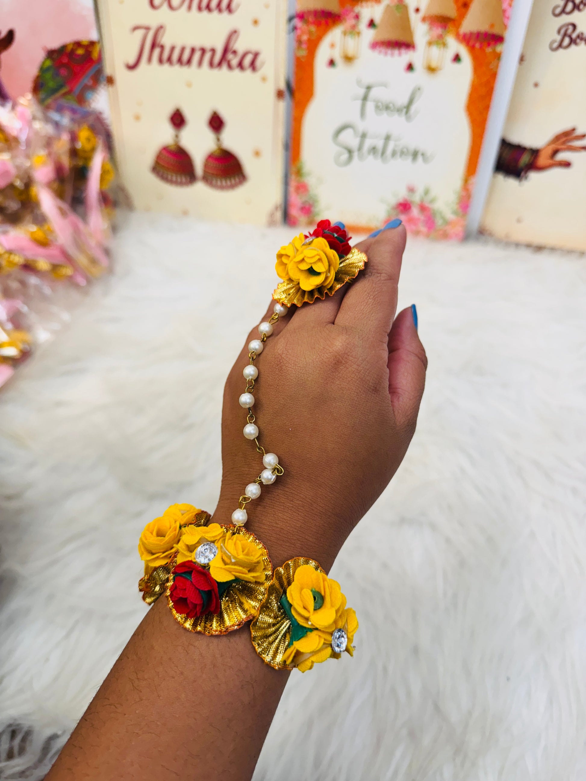 The Hathphool is an artificial flower accessory designed to enhance traditional attire. Crafted from high-quality materials, it offers a realistic appearance while ensuring durability. This piece serves as a sustainable alternative to real flowers, eliminating the need for constant replacement and maintenance, thus providing cost-effective elegance for various occasions.