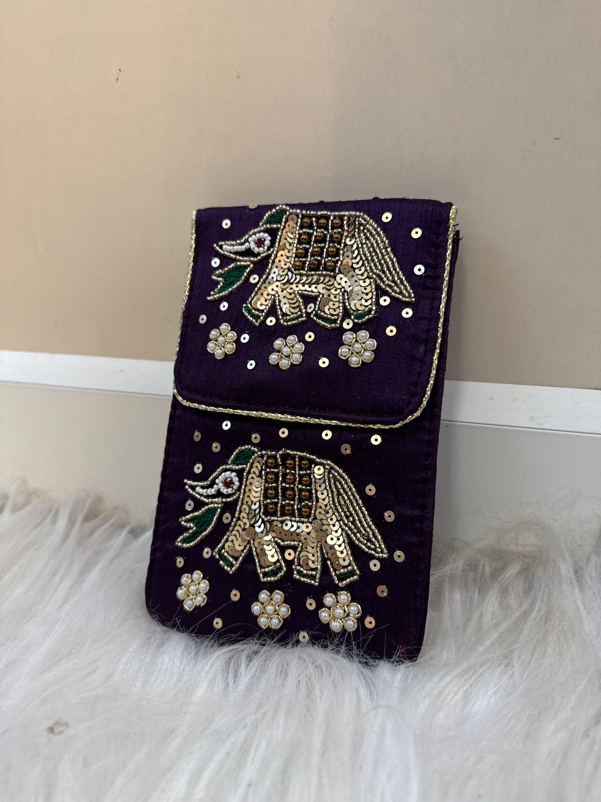 This hand embroidered mobile pouch with sling is perfect for securely storing and carrying your phone. With a back zipper for added protection, it can fit most mobile phones. Keep your device safe and stylish with this versatile and convenient pouch.