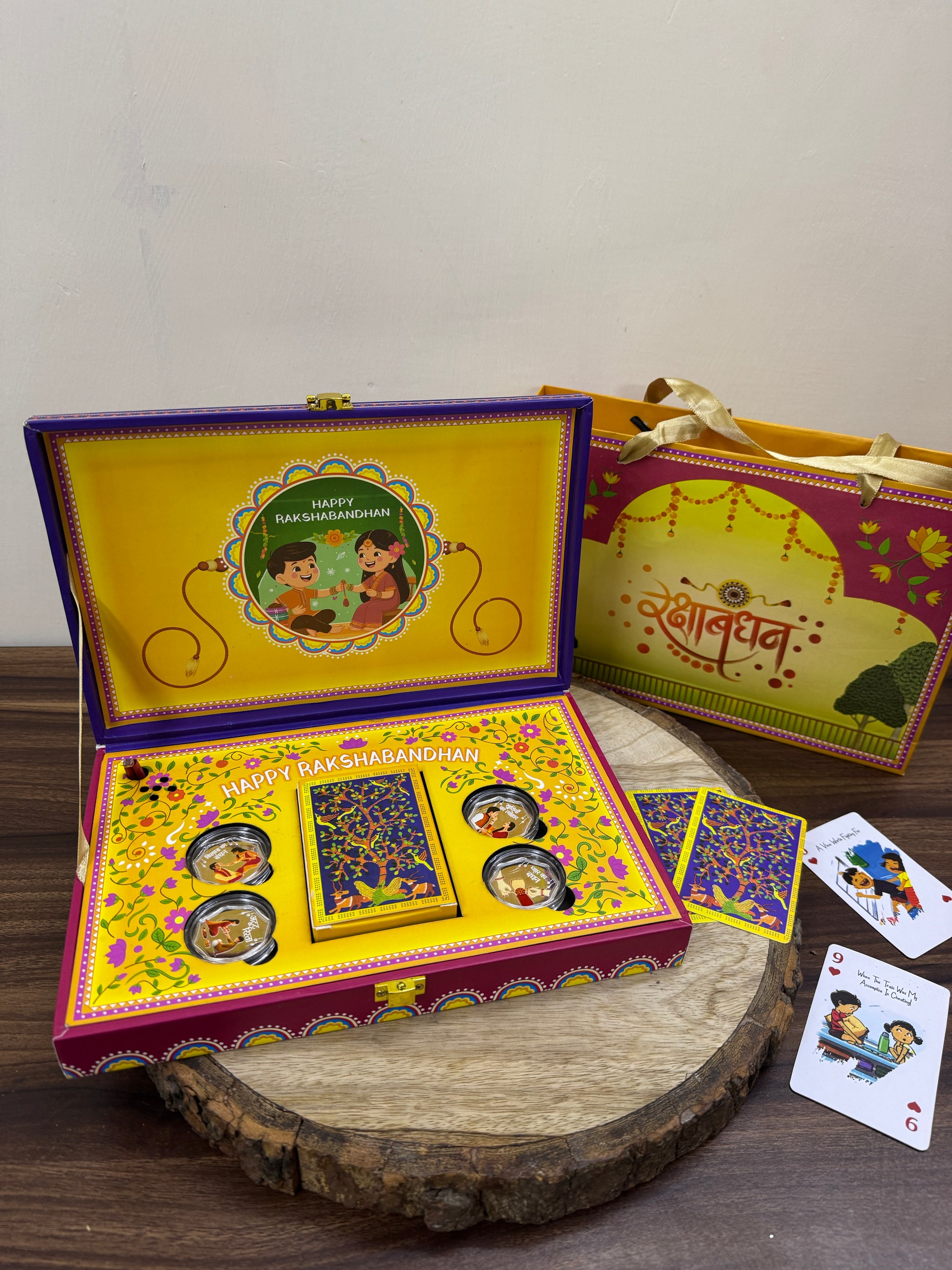 This Rakhshabandhan gift set includes 4 pure silver coins and a set of playing cards, making it the perfect present for your loved ones. Celebrate this special occasion with traditional and valuable gifts.