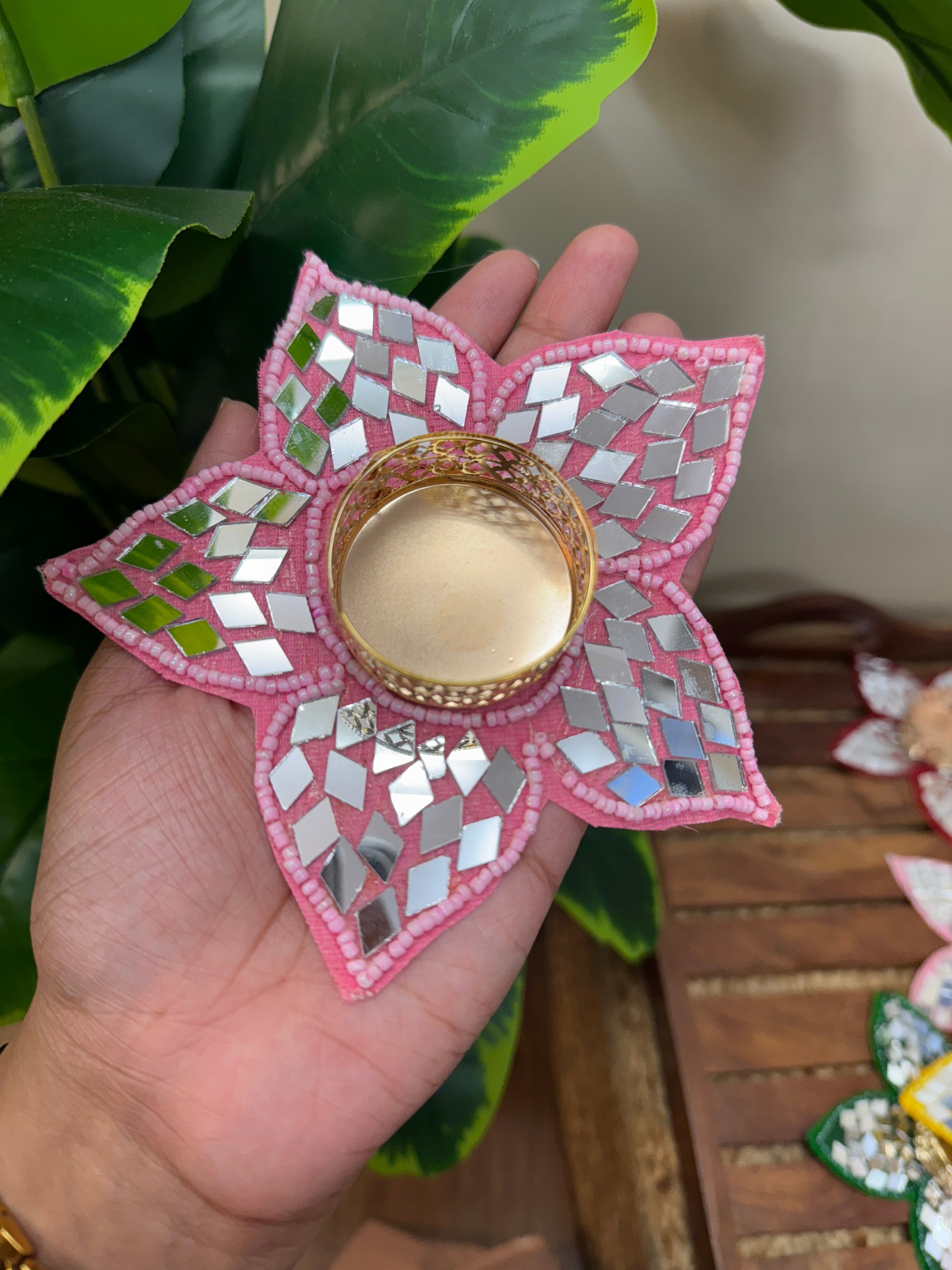 Introducing the Mirror Flower Patti Tealight - a stunning piece designed to elevate any home decor. Its intricate mirror leaf flower design reflects the light of the tealight, creating a beautiful ambiance. With its unique features, this tealight is sure to add a touch of elegance to any room.